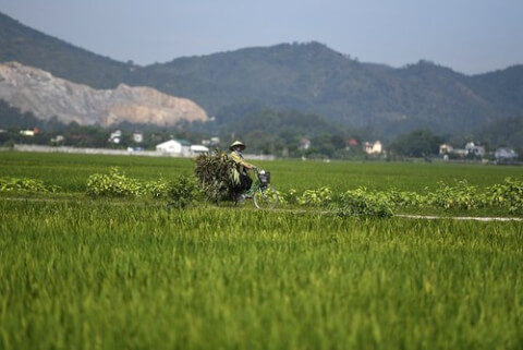 Một nông dân đạp xe qua ruộng lúa ở Thanh Hóa hôm 18/3/2018 AFP