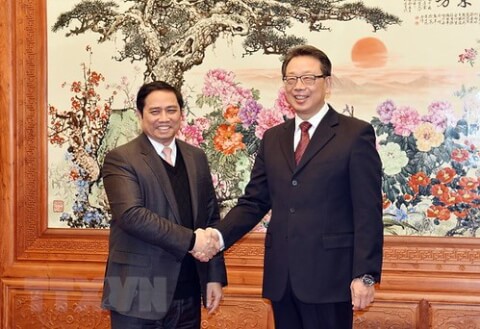Ngày 24/01/2018 Ủy viên Bộ Chính trị, Bí thư Trung ương Đảng, Trưởng ban Tổ chức Trung ương Phạm Minh Chính và Ủy viên Bộ Chính trị, Bí thư Ban Bí thư, Trưởng ban Tổ chức Trung ương Đảng Cộng sản Trung Quốc Trần Hy bắt tay thân mật. (Ảnh : Vĩnh Hà/TTXVN)