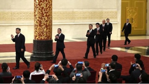 6 người đàn ông theo sau Tập Cận Bình đều mặc những bộ y phục sậm màu, đeo cà vạt đỏ, hai tay để sát người, gần như trong tư thế chào cờ, họ đã lắng nghe tổng bí thư, nhân vật số 1 của Đảng cộng sản Trung Quốc phát biểu.