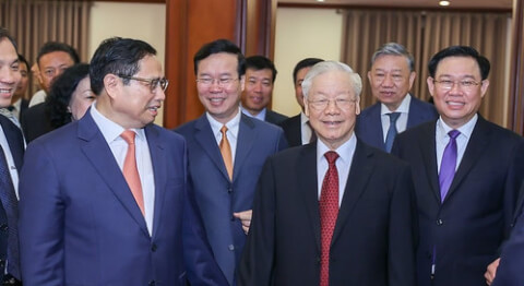 Bộ Tứ + 1 đến dự phiên họp bất thường của Quốc hội ngày 15/01/2024 gồm các ông Phạm Minh Chính, Võ Văn Thưởng, Nguyễn Phú Trọng, Vương Đình Huệ và Tô Lâm (phía sau)