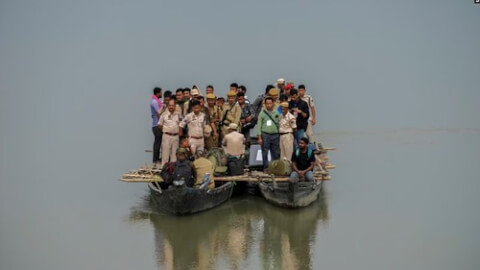 Nhân viên phòng phiếu và nhân viên an ninh đi thuyền nhỏ qua sông đến phòng phiếu ở vùng sâu vùng xa bên kia sông Brahmaputra vào đêm bầu cử quốc hội ở vùng Đông Bắc Ấn Độ, 18 tháng Tư, 2024.
