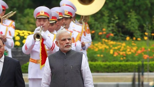 Thủ tướng Việt Nam Nguyễn Xuân Phúc và đồng nhiệm Ấn Độ Narendra Modi duyệt đội quân danh dự trong lễ đón tiếp tại Hà Nội, ngày 03/09/2016 Reuters/Kham