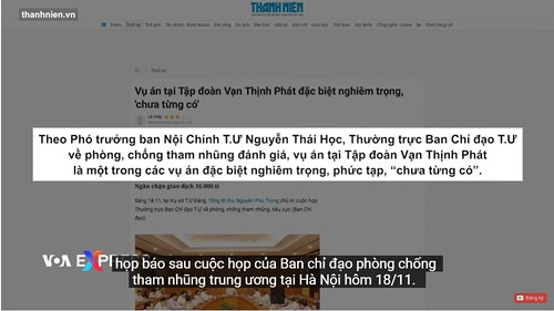 Vụ án tại tập đoàn Vạn Thịnh Phát mang tính chất ‘đặc biệt nghiêm trọng, phức tạp, chưa từng có’, cơ quan chống tham nhũng của Việt Nam đánh giá sau cuộc họp dưới sự chủ trì của Tổng bí thư Nguyễn Phú Trọng, theo báo Thanh Niên.