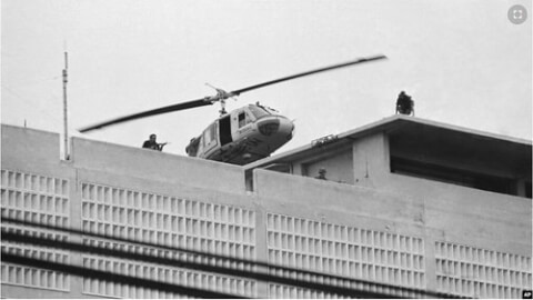 Lúc 7g53, chiếc trực thăng cuối cùng của Thủy Quân Lục chiến Mỹ cất cánh từ nóc Tòa Đại sứ Hoa Kỳ tại Sài Gòn, Việt Nam, ngày 30/4/1975. (AP Photo/Phu)