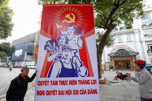 Công nhân dựng tấm biển chào mừng Đại hội Đảng 13 ở Hà Nội hôm 12/1/2021 - Reuters