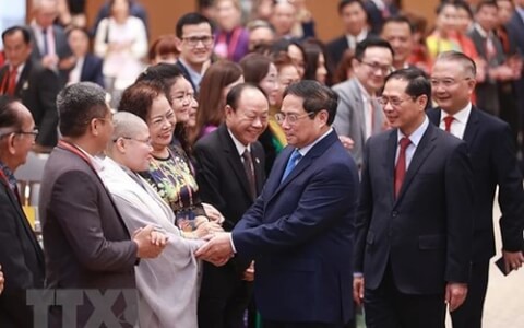 Thủ tướng Phạm Minh Chính với kiều bào tiêu biểu dự chương trình Xuân Quê hương 2023. Ảnh : Dương Giang/TTXVN