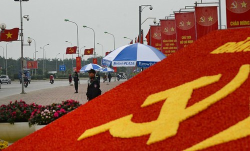 Lực lượng cảnh sát đặc biệt đứng gác bên ngoài Trung tâm Hội nghị Quốc gia Mỹ Đình, Hà Nội, nơi diễn ra Đại hội toàn quốc lần thứ 12 của Đảng Cộng sản Việt Nam ngày 25 tháng 1 năm 2016. AFP