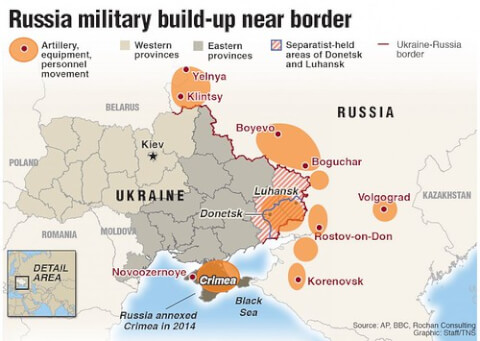 Tổng thống Nga Vladimir Putin đang dùng Ukraine làm sàn khiêu vũ với Mỹ và các nước NATO. Bản đồ quân đội Nga bao vây Ukraine