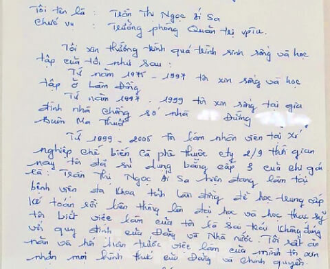 Từ 1999-2005 tôi làm nhân viên tại Xí nghiệp chế biến cà phê thuộc Cty 2/9 thời gian nay tôi đã sử dụng bằng cấp 3 của chị gái là : Trần Thị Ngọc Ái Sa hiện đang làm lại bệnh viện đa khoa tỉnh Lâm Đồng để học trung cấp kế toán rồi liên thông lên đại học và học thạc sỹ tôi biết việc làm của tôi là sai trái không đúng...".