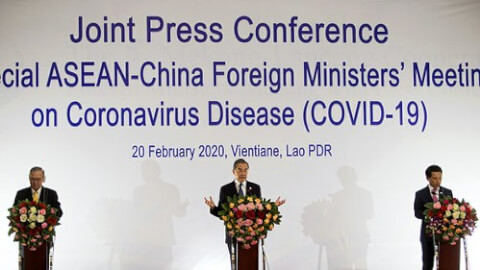 Bộ trưởng ngoại giao Trung Quốc Vương Nghị (giữa) cùng những người đồng nhiệm Teodoro Lopez (trái) của Philippines và Saleumxay Kommasith (Lào) tại họp báo của ASEAN và Trung Quốc ở Vientiane, Lào hôm 20/2/2020 - Reuters