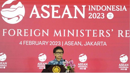 Ngoại trưởng Indonesia Retno Marsudi, nước chủ tịch luân phiên ASEAN năm 2023, phát biểu tại buổi họp báo ngày 04/02/2023, tại Jakarta, Indonesia. AP - Achmad Ibrahim
