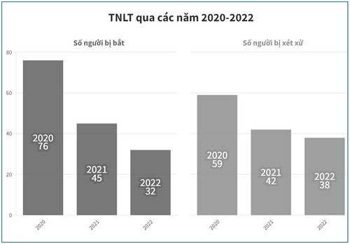 Năm 2020 là năm có nhiều người bị bắt nhất so với hai năm 2021 và 2022 với tổng số người bị bắt là 76 người. Con số này trong các năm 2021 và 2022 là 45 và 32 người. Khoảng một nửa số người bị bắt trong năm 2020 liên quan đến vấn đề đất đai.