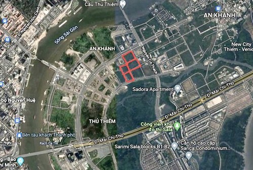 Bốn lô đất Thủ Thiêm (màu đỏ) đấu giá vào năm 2021 - Courtesy Google Map