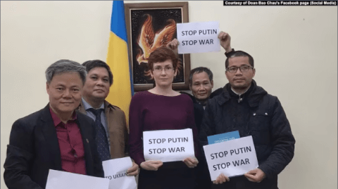 Ông Đoàn Bảo Châu (trái) và một số người trao tiền quyên góp cho Đại biện Lâm thời Ukraine Nataliya Zhynkina, 4/3/2022.
