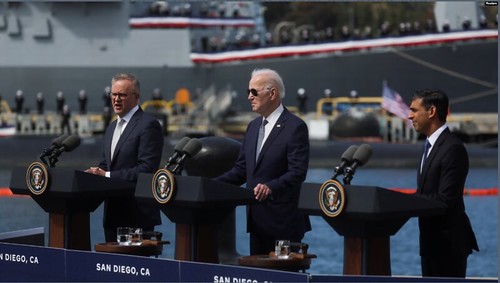 Tổng thống Joe Biden tiếp thủ tướng Anh và Úc ngày 13/03/2023 tại căn cứ hải quân ở San Diego, California, Hoa Kỳ, bàn về hợp tác quốc phòng và hợp đồng tầu ngầm nguyên tử với Canberra. Giai đoạn khủng hoảng ngoại giao với Pháp dường như đã qua vì ưu tiên chính hiện nay là củng cố liên minh để làm đối trọng với sức mạnh quân sự của Trung Quốc.