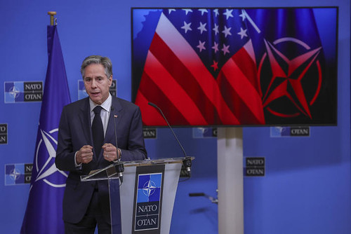 Ngoại trưởng Hoa Kỳ Antony Blinken phát biểu tại một cuộc họp báo trong cuộc họp của các ngoại trưởng NATO tại trụ sở NATO ở Brussels ngày 5/4/2023 trước khi sang thăm Việt Nam và Nhật Bản. Olivier Matthys / AP