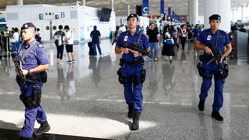 Cảnh sát đi tuần tại phi trường Hồng Kông ngày 14/08/2019, sau những vụ xô xát với người biểu tình hôm trước. Reuters/Thomas Peter