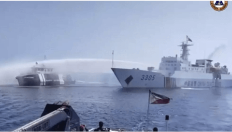Tàu Hải cảnh của Trung Quốc dùng vòi rồng uy hiếp tàu Philippines, trong một lần tiến vào bãi cạn Scarborough, ngày 09/12/2023. AP