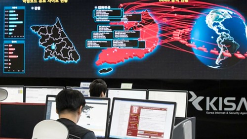 Ảnh tự liệu chụp ngày 15/05/2017 : Các nhân viên an ninh mạng Hàn Quốc theo dõi màn hình mô tả các cuộc tấn công mạng bị tình nghi do tin tặc Bắc Triều Tiên tiến hành. AP - Yun Dong-jin