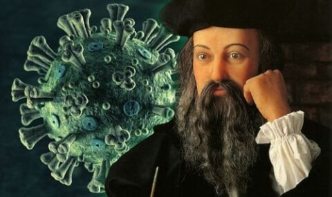 "Nostradamus đã viết vào năm 1555 như thế này : Sau này, vào một năm sinh đôi (2020), một nữ hoàng (corona) đến từ Phương Đông và phát tán một vết thương trong bóng tối của đêm đen, trên xứ sở của 7 ngọn đồi và sẽ biến thành tro bụi hoàng hôn của con người, để tàn phá và hủy diệt thế giới. Đó sẽ là dấu chấm hết cho nền kinh tế thế giới mà bạn đã từng biết".
