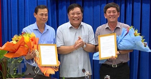 Ban Thường vụ Tỉnh ủy điều động ông Dư Minh Hùng (phải), Tỉnh ủy viên, Bí thư Huyện ủy Năm Căn nhận nhiệm vụ tại Sở Y tế để Chủ tịch Ủy ban Nhân dân tỉnh bổ nhiệm giữ chức vụ Giám đốc Sở Y tế. (Ảnh : TTXVN phát)