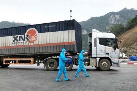 Nhân viên y tế Việt Nam đứng nhìn một thương nhân Trung Quốc trong bộ đồ bảo hộ đi hoverboard qua các xe container chở hàng từ Trung Quốc vào Việt Nam qua cửa khẩu Hữu Nghị ở Lạng Sơn hôm 20/2/2020. Reuters