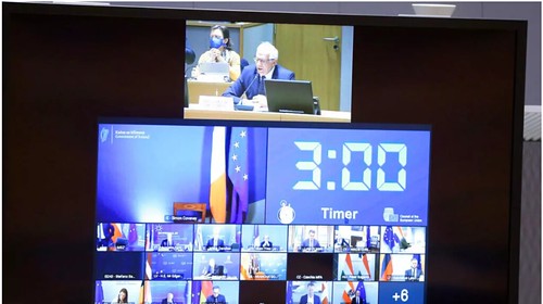 Qua video hội nghị, lãnh đạo ngoại giao Châu Âu Josep Borrell (màn hình trên) chủ trì cuộc họp các ngoại trưởng 27 thành viên Liên Hiệp Châu Âu, Bruxelles, Bỉ, ngày 19/04/2021. AP - Francois Walschaerts