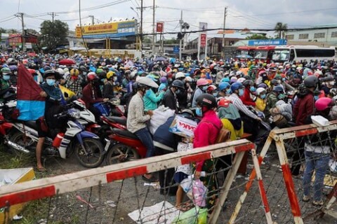 Hay hình ảnh hàng ngàn hàng vạn người dân ùn ùn kéo nhau từ Sài Gòn, Bình Dương, Đồng Nai… tháo chạy về quê ở miền Trung, miền Bắc, đi bằng xe gắn máy, xe tự chế, và kể cả đi bộ, vượt hàng trăm hàng ngàn cây số, ăn ngủ vạ vật giữa đường, với đủ mọi cảnh đời bi đát.