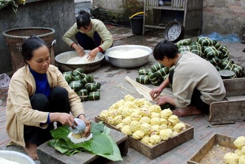Một gia đình đang gói bánh chưng Tết ở làng Tranh Khúc, ngoại thành Hà Nội năm 2002 - AFP