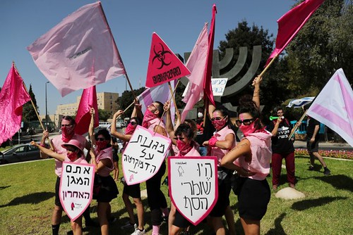 Người Israel phản đối luật hạn chế biểu tình trong đợt cách ly Covid-19. Một trong ba tấm biểu ngữ có nội dung "Bảo vệ nền dân chủ". Ảnh chụp ngày 29/9/2020. Reuters/Ronen Zvulun