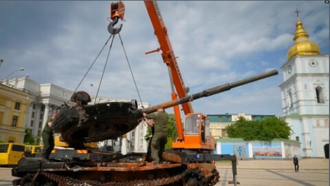 Ukraine đang cẩu một chiếc tank của Nga bị phá hủy để làm biểu tượng chiến tranh ở trung tâm Kyiv, 20 tháng Năm.