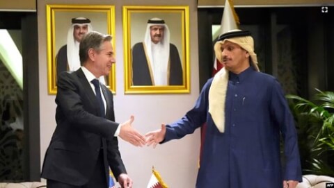 Ngoại trưởng Antony Blinken (trái) gặp Thủ Tướng kiêm Ngoại Trưởng Qatar tại Doha, 6 tháng Hai, trong chuyến công du Trung Đông.
