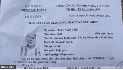 Bản kết luận giám định pháp y về sức khỏe ông Phan Văn Thu do gia đình cung cấp cho hay ông Thu chỉ bị suy tim cấp độ II nên không được ngưng thi hành án để về nhà dưỡng bệnh