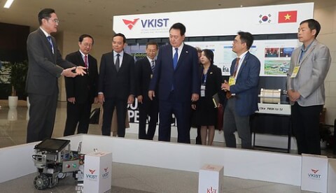 Ngày 24/6, tại Trung tâm R&D Samsung Electronics, Hà Nội, Việt Nam, Chủ tịch Samsung Electronics Lee Jae-yong (trái) giới thiệu robot di động đa hướng với Tổng thống Hàn Quốc Yoon Suk-yeol (giữa). Nguồn: Thời báo Hoàn Cầu.