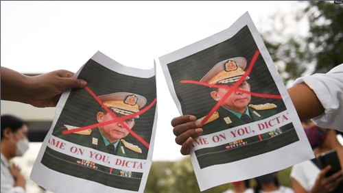 Biểu tình trước trụ sở Liên Hiệp Quốc tại Bangkok, chống quân đội đảo chính tại Miến Điện. Hình bị gạch chéo là tướng Min Aung Hlaing, Tổng tư lệnh Quân đội Miến Điện.