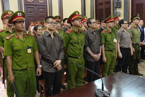 Phiên xử 12 người bị cáo buộc thuộc tổ chức Chính phủ Quốc gia Việt Nam lâm thời. Phiên xử diễn ra tại Thành phố Hồ Chí Minh hôm 22/8/2018 - AFP