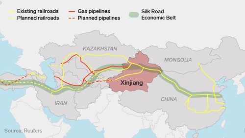 Bắc Kinh hy vọng rằng Tân Cương có thể đóng vai trò như một trung tâm vận chuyển và trung tâm về thương mại, hậu cần và văn hóa của khu vực. Trong năm 2017, khoảng 66 tỷ USD đã được đầu tư vào cơ sở hạ tầng tại Tân Cương – tăng 50% so với năm trước. Đường bộ và đường sắt cao tốc đã được xây dựng để kết nối khu vực này với các khu vực khác của Trung Quốc.