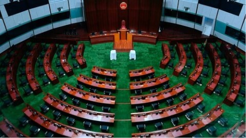 Nghị Viện Hồng Kông với quốc huy Trung Quốc thay thế cho hình ảnh 5 cánh hoa biểu trưng của đặc khu hành chính, ngày 07/12/2021. AP - Vincent Yu