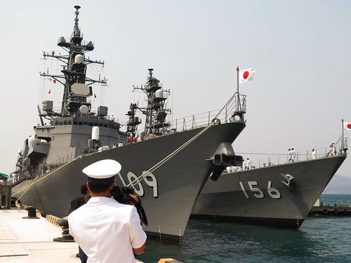 Hình chụp hôm 12/4/2016 : một sĩ quan Hải quân Việt Nam quay phim các tàu chiến của Nhật ở cảng Cam Ranh - AFP