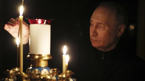 Trong ngày quốc tang 24/03/2024, Tổng thống Nga Vladimir Putin thắp nến tưởng niệm nạn nhân vụ khủng bố nhắm vào rạp hát Crocus City Hall, ngoại ô Moskva. AP - Mikhail Metzel