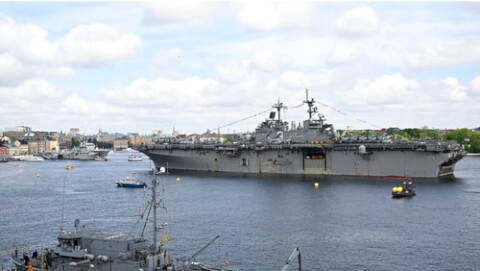 Soái hạm USS Kearsarge vào cảng Stockholm. Từ ngày 02 đến 05/06, bốn chục chiến hạm thuộc hạm đội của NATO đã ghé thăm cảng Stockholm trước khi tập trận tại biển Baltic từ 05 đến 17/06/2022. AP - Henrik Montgomery