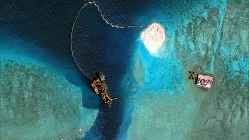 Ảnh chụp vệ tinh ngày 08/04/2015 cho thấy các hoạt động bồi đắp một đảo nhỏ và phát triển một cảng nhân tạo tại những bãi rạn san hô của Trung Quốc trên quần đảo Trường Sa, Biển Đông. Reuters/CSIS's Asia Maritime Transparency