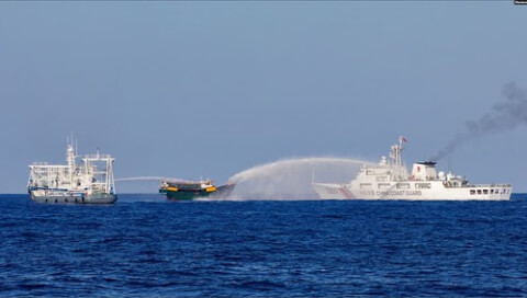 Tàu Cảnh sát Biển Trung Quốc bắn vòi rồng vào tàu tiếp tế của Philippines cho Bãi Cỏ Mây ngày 5/3/2024.