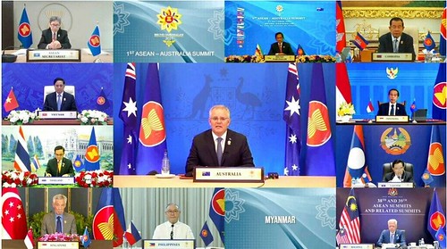Ảnh tự liệu : Thủ tướng Úc Scott Morrison (giữa màn hình) họp thượng đỉnh trực tuyến với các lãnh đạo Asean, ngày 27/10/2021. © Brunei ASEAN via AP