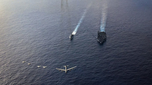 Bên cạnh đó, cũng hôm qua, thông qua mạng xã hội Twitter, Hạm đội Thái Bình Dương của Mỹ đăng tải bức ảnh với chú thích máy bay ném bom B-52H cùng chiến đấu cơ F-15C bay trên tàu sân bay USS Theodore Roosevelt và tuần dương hạm USS Bunker Hill ở biển Philippines. Theo chú thích bức ảnh, đây là hình ảnh từ cuộc tập trận phòng không chung của hải quân và không quân.