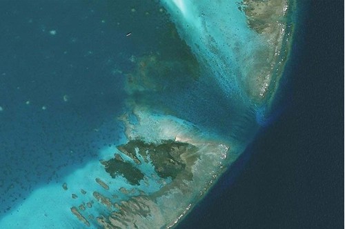 Ảnh chụp vệ tinh cho thấy các rạn san hô ở bãi cạn Scarborough bị tàn phá, được cho là do hoạt động khai thác ngao của ngư dân Trung Quốc. (Nguồn: Phistar)