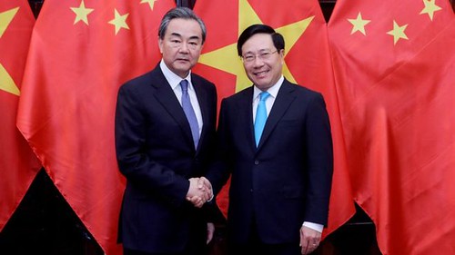 Bộ trưởng Ngoại giao Việt Nam Phạm Bình Minh (phải) bắt tay Bộ trưởng Ngoại giao Trung Quốc Vương Nghị (trái) tại Hà Nội vào ngày 1/4/2018