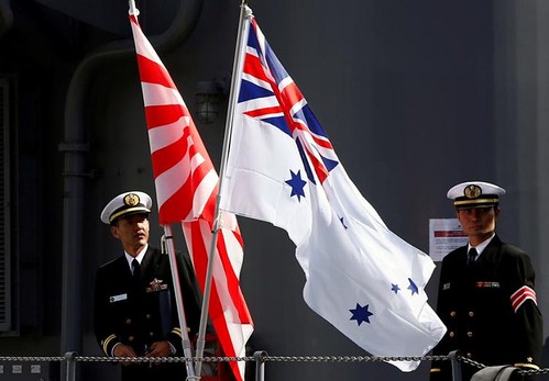 Cờ Hải quân Nhật Bản và Úc trên chiến hạm Nhật Umigiri ngày 19/04/2016 tại căn cứ hải quân Úc Garden Island (Sydney - Úc). Hải quân Úc và Nhật Bản thường xuyên tập trận với nhau. Reuters - Jason Reed