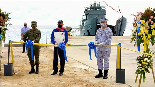 Bộ trưởng Quốc Phòng Philippines, Delfin Lorenzana (giữa), cắt băng khánh thành công trình bến tàu trên đảo Thị Tứ, ngày 09/06/2020. AFP - HANDOUT