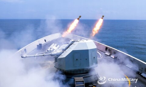 Khinh hạm tên lửa dẫn đường Yulin (Hull 569) thuộc Bộ Tư lệnh của PLA bắn tên lửa vào tàu ngầm thù địch giả trong một cuộc tập trận ở Biển Đông vào cuối tháng 3 Năm 2020.